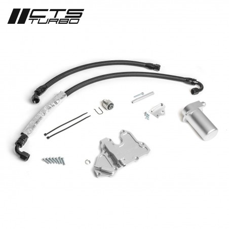 Este catch can o recuperador de aceite CTS Turbo destinado a los motores 2.0 TSI EA888.3 equipado los Golf 7 GTI / Golf 7 R / Leon 3 Cupra y S3 8V se instala sin modificaciones para impedir la formación de depósitos de aceites usados en el circuito de admisión, reduciendo la acumulación de impurezas para conservar tu mecánica en perfecto estado de funcionamiento ! Si el conducto de llenado del líquido de limpiaparabrisas de tu vehículo se encuentra a la derecha, elige la versión con kit de reubicación opcional.